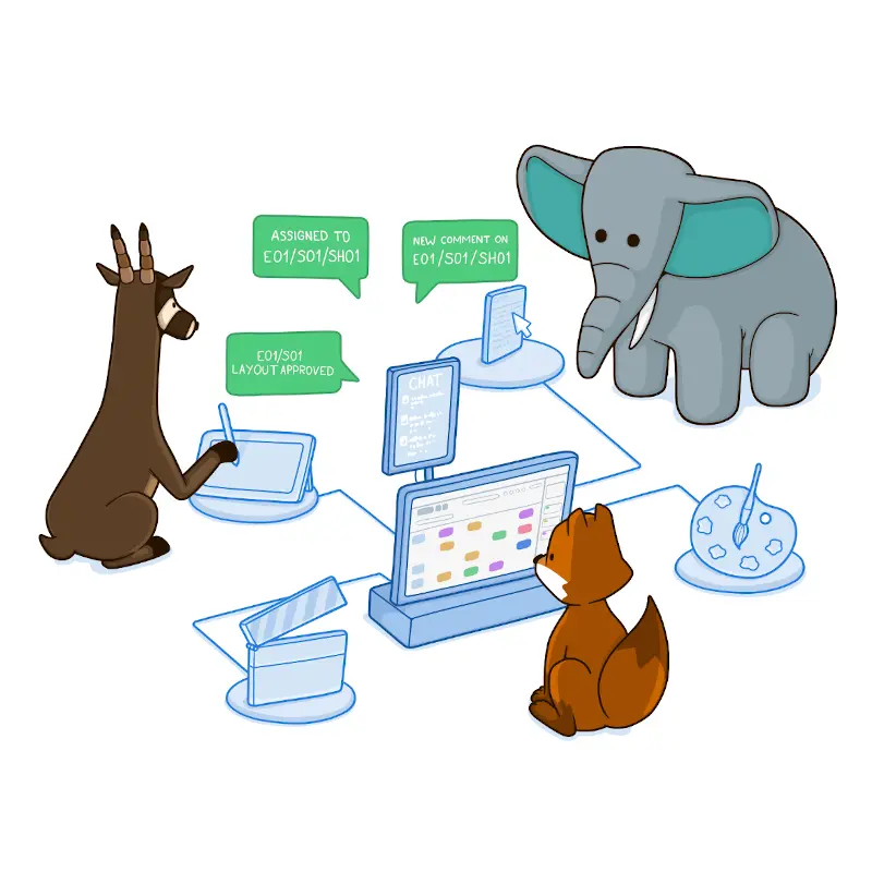 Vos données circulent dans tout votre pipeline. C'est pourquoi nous proposons des intégrations pour faciliter la communication entre vos outils. Les artistes publient ainsi leurs livrables depuis leurs outils et les équipes peuvent envoyer des notifications dans vos applications de chats. Et enfin, vous pouvez requêter notre API directement depuis votre code.